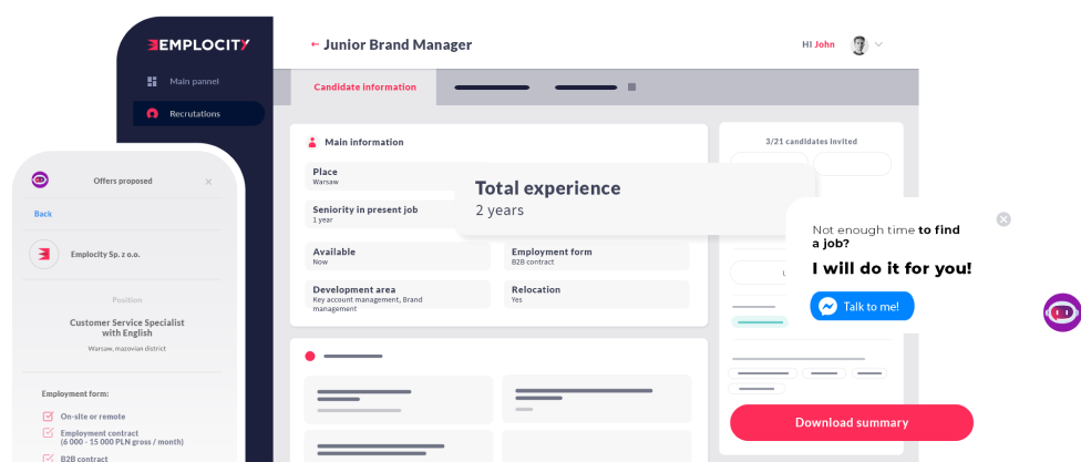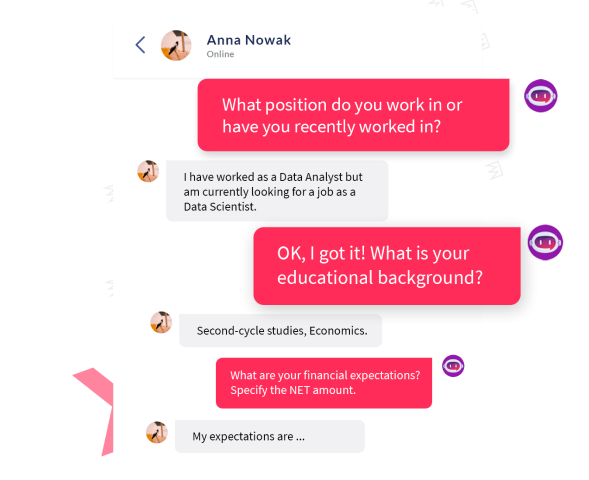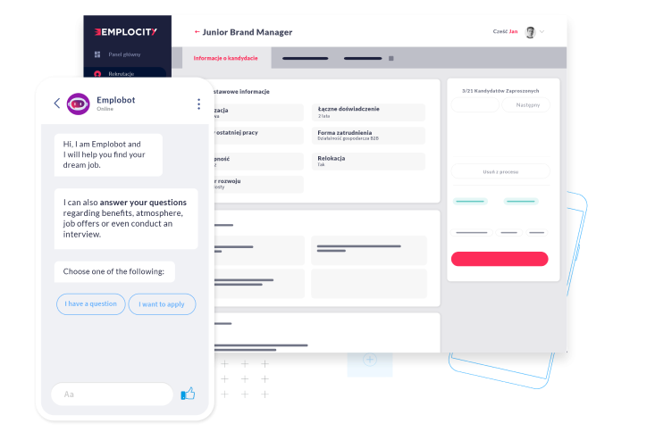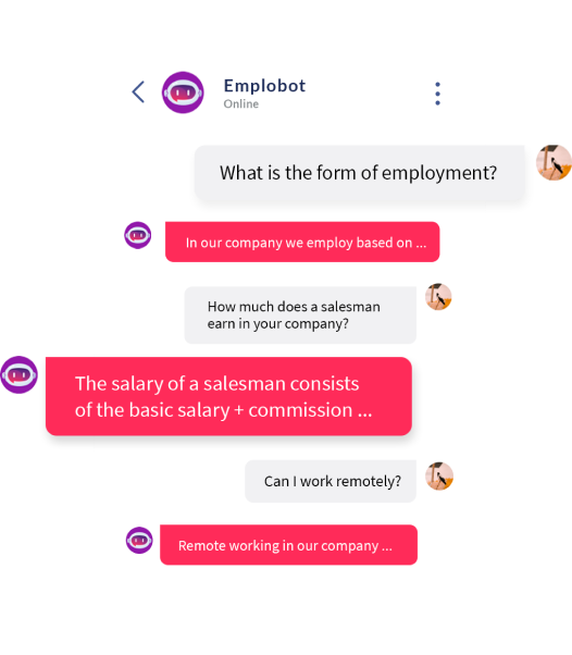 It acts as an automatic recruiter and guide for your future employees. During a few minutes of conversation with a candidate, Emplobot asks a series of questions and on the basis of the information obtained in this way creates an individual profile of the candidate, which is then matched with your current job offers. If the candidate meets the requirements of a given recruitment process, he/she is invited to a further stage. The pre-selection and candidate matching process takes literally seconds.