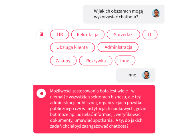 Platforma Emplocity pozwala na tworzenie chatbotów zgodnie z Twoją potrzeba i oczekiwaniami. Zbuduj swojego chatbota z gotowych komponentów i zdefiniowanych zadań lub twórz własne, unikalne rozwiązania. Wykorzystaj chatbota do automatyzacji komunikacji i zadań w dowolnym obszarze, zarówno typowo biznesowym (sprzedaż, obsługa klienta, rekrutacja), jak i rozrywkowym, edukacyjnym czy społecznym.