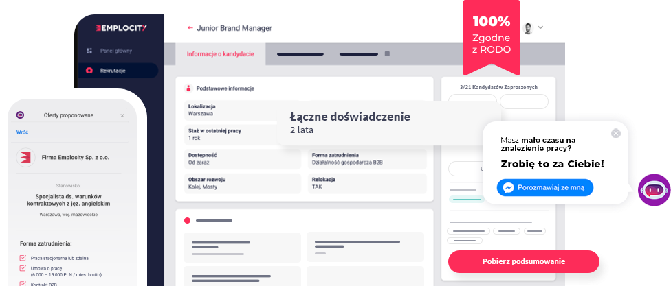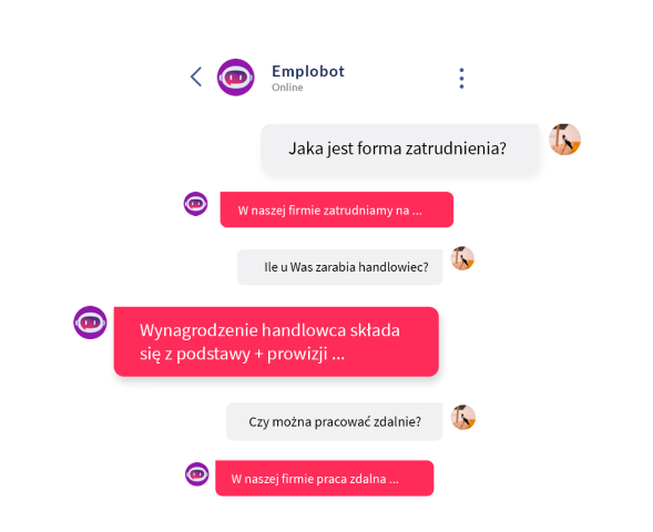 Pełni funkcję automatycznego rekrutera i przewodnika dla Twoich przyszłych pracowników. W trakcie kilkuminutowej rozmowy z kandydatem Emplobot zadaje szereg pytań, a na podstawie pozyskanych w ten sposób informacji tworzy indywidualny profil kandydata, który następnie dopasowuje do Twoich aktualnych ofert pracy. Jeśli kandydat spełnia wymagania danej rekrutacji, otrzymuje zaproszenie do dalszego etapu. Proces preselekcji i dopasowania kandydata trwa dosłownie kilka sekund.