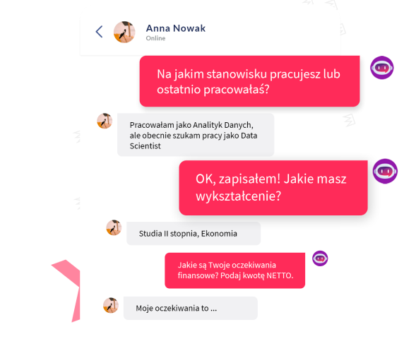 Automatyzuje proces odpowiadania na najczęstsze pytania i wątpliwości osób zainteresowanych pracą w Twojej firmie. Wykorzystując zdefiniowaną wcześniej bazę wiedzy jest w stanie odpowiadać na kwestie dotyczące dowolnie wybranej tematyki, np.: benefitów, etapów rekrutacji, sposobu aplikowania oraz zarekomendować kandydatowi pracę w Twojej firmie. Dzięki temu idealnie wpisuje się w strategie Employer Branding’owe firm, którym zależy na otwartości i budowaniu pozytywnych doświadczeniach kandydatów.