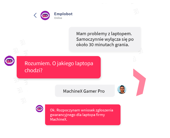 Usprawniaj i przyspieszaj obsługę klienta zbierając zlecenia i wykonując zadania w sposób automatyczny. Chatbot w naturalny sposób porozmawia z Twoimi klientami i rozwiąże ich problemy.