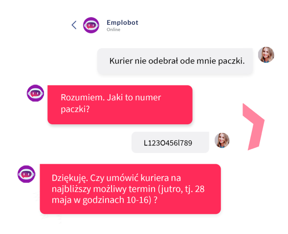 Wystarczy prosta identyfikacja klienta lub zlecenia, by chatbot samodzielnie odpowiedział na pytania, podał status zamówienia, czy przesłał fakturę. A to wszystko w integracji z Twoimi systemami.