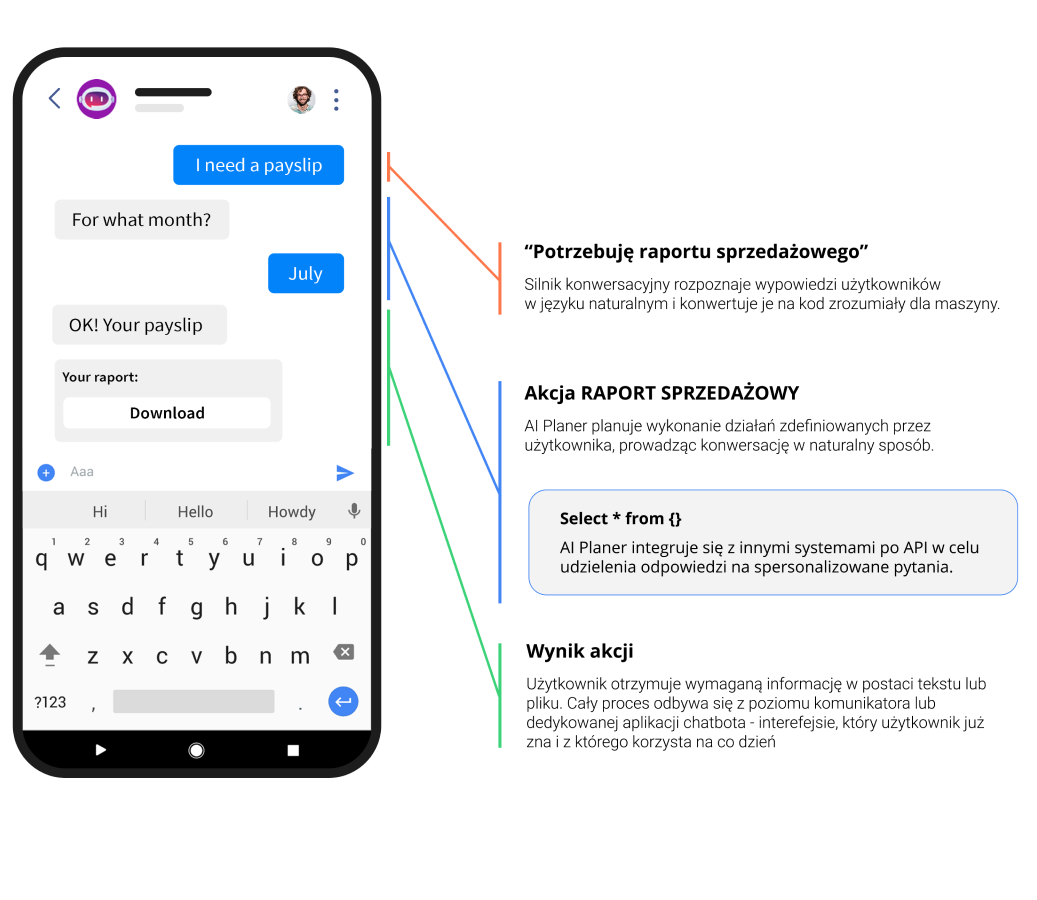 Nasz interfejs użytkownika, wyposażony w algorytmy sztucznej inteligencji, umożliwia użytkownikowi komunikowanie się z systemem w sposób naturalny i intuicyjny, przypominając interakcję z drugim człowiekiem. Tym samym użytkownik nie musi uczyć się jego obsługi - wystarczy, że zada pytanie w oknie chat za pomocą języka naturalnego i w szybki sposób uzyska odpowiedź w formie tekstu lub dokumentu. Nie wymaga instalowania od użytkownika dodatkowego oprogramowania na urządzeniu. Może zostać zintegrowany z platformami zewnętrznymi, czyli komunikatorami (Messenger, Slack, Ms Teams, Whatsapp) lub funkcjonować jako dedykowana aplikacja web/mobile.